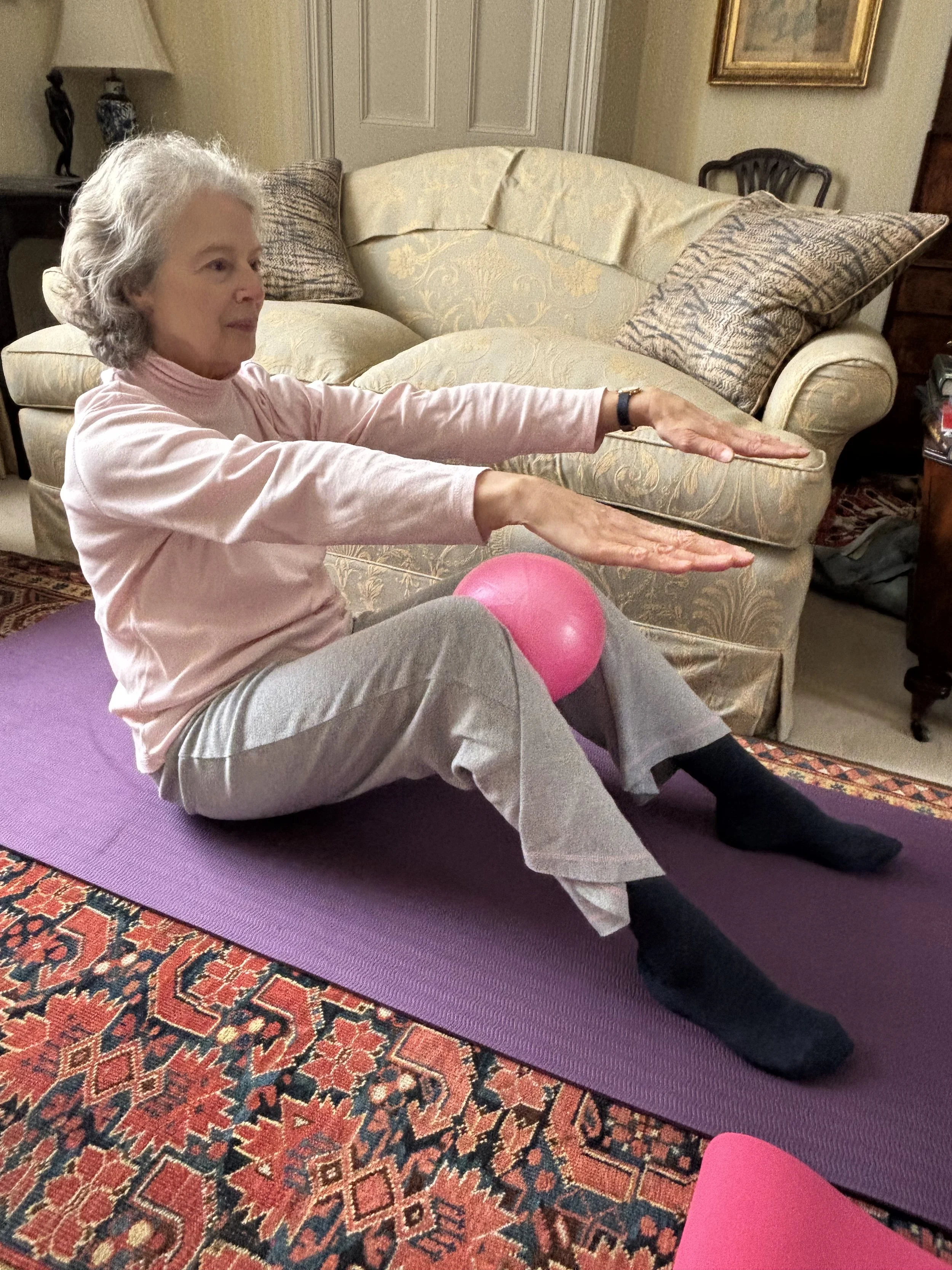 Recently, our sessions have focused on full-body mobilisation with a particular emphasis on spinal mobility and improving shoulder stabilisation, which has been a particular challenge for her.